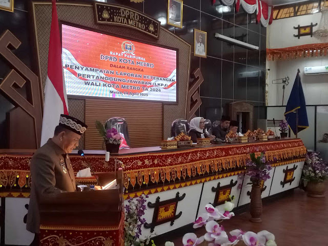 Walikota Metro membacakan Penyampaian Laporan Keterangan Pertanggung Jawaban (LKPJ) Wali kota Metro Tahun Anggaran 2024. Ia menyebutkan, laporan tersebut merupakan amanat yang diatur dalam UU nomor 23 tahun 2014, tentang pemerintahan daerah.