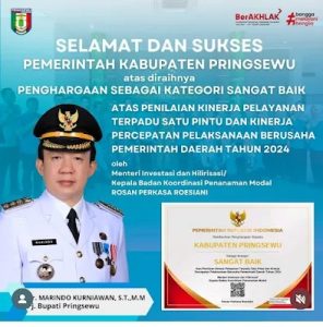 Pringsewu – Penjabat Bupati Pringsewu, Dr. Hi. Marindo Kurniawan S.T., M.T, kembali menorehkan prestasi gemilang dengan meraih penghargaan tingkat nasional untuk katagori sangat baik untuk bidang pelayanan publik.