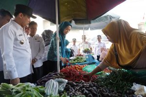 Pj.Bupati Pringsewu bersama Pj.Ketua TP-PKK Kabupaten Pringsewu Agnesia Marindo pada kesempatan tersebut berkeliling ke dalam pasar dan berdialog dengan para pedagang. Bahkan, berbelanja sejumlah kebutuhan pokok hingga sayuran dan buah-buahan.