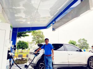 “Saat perjalanan pulang dari Palembang untuk Kembali ke Bandar Lampung, mobil listrik melakukan pengisian daya baterai di Rest Area Tol KM 172B dari 15 persen menjadi 80 persen. Perjalanan kembali ke Bandar Lampung berakhir di Tugu Adipura dengan sisa kapasitas baterai sebesar 41 persen.