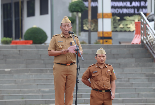 Bandar Lampung — Staf Ahli Gubernur Bidang Pemerintahan, Hukum dan Politik, Ganjar Jationo menjadi Pembina Apel Mingguan di Lingkungan Sekretariat Daerah Provinsi Lampung bertempat di Lapangan KORPRI, Senin 10/2/2025.