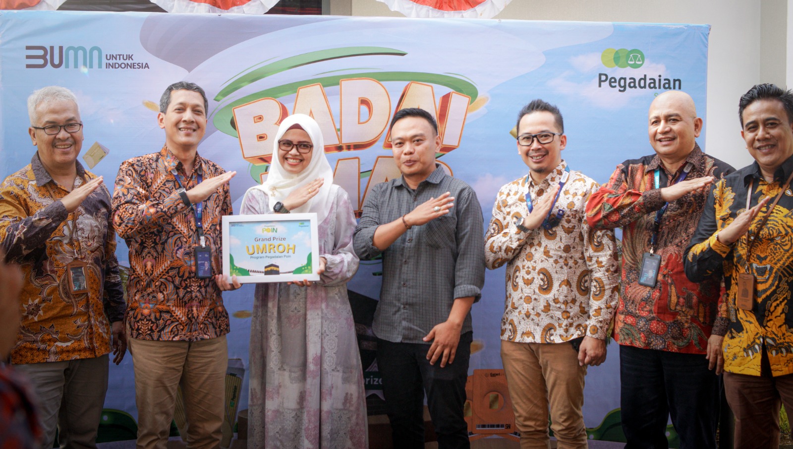 Pemimpin wilayah Pegadaian III Palembang, Dwi Hadi Atmaka melakukan simbolis penyerahan hadiah badai emas kepada satu nasabah Pegadaian Syariah Radin Intan, yang mendapatkan hadiah Grand Prize umroh, senilai @35 Juta Rupiah serta dua (2) Nasabah Pegadaian Cabang Metro, dan Cabang Kedaton yang beruntung mendapatkan hadiah Emas masing-masing dengan nilai 1,23 Gram.