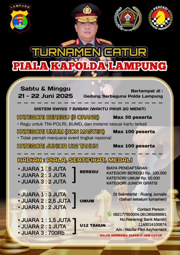 DIARY.CO.ID, Turnamen Catur Piala Kapolda Lampung pendaftaran mulai dibuka hari ini 10-19 Juni yang akan digelar di GSG Presisi Polda Lampung.